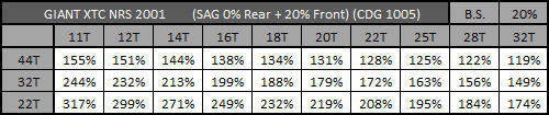 Como podéis ver en la Tabla de Excel el sistema NRS está siempre por encima del 100% de Anti-squat, incluso en las combinaciones mas extrañas. En plato mediano y pequeño los porcentajes están en torno al 200%, por lo que el sistema tenía una tendencia muy fuerte a extenderse al pedalear. El amortiguador en teoría debía configurarse con un 0% de Sag, por lo que el sistema no va a sufrir ningún tipo de balanceo, pero evidentemente la absorción de obstáculos se va a ver muy perjudicada ya que la tensión de la cadena mantiene al sistema semi-bloqueado. El Pedal Kickback (8º con un recorrido pequeño...) como ya os podéis imaginar era bastante alto, mientras que el Brake Squat (20%) estaba en un valor muy bajo.