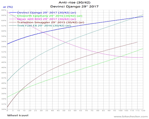 Como podéis ver en la tabla de excel y en las imágenes anteriores la nueva Merida One-Sixty 2017 tiene una Eficacia de Pedaleo muy alta, con unos porcentajes de Anti-squat en torno al 100% en la mayoría de los desarrollos. El modelo anterior estaba optimizado en torno a una transmisión tipo 2x10 y funcionaba muy bien, pero hoy en día casi todas las bicis de Enduro utilizan una transmisión tipo 1x11 y este cambio en el sistema es muy acertado. El Pedal-kickback (18º) es proporcional al AS y está al mismo nivel que todos los sistemas de este tipo, esto es algo inevitable... Lo que si es evitable es tener un porcentaje de Brake-squat (97%) tan elevado, pero por algun motivo en Merida no han querido utilizar un sistema tipo FSR...