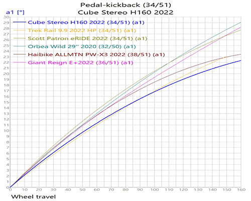 Como podéis ver en la tabla de excel y en las gráficas anteriores el sistema de la Vitus E-Sommet va a tener un comportamiento bastante activo. Los porcentajes de Anti-squat se mantienen en torno al 80% en los desarrollos cortos y el mayor problema es que bajan un poco mas en los largos. El sistema por lo tanto va a depender un poco del bloqueo del amortiguador en subidas por pista o por carretera, pero a cambio va a leer muy bien el terreno y va a mantener mucha mas tracción en subidas técnicas. Como es lógico el Pedal-kickback (23º) está en un nivel intermedio y el Brake-squat (47%) se mantiene en un nivel muy bajo, lo habitual en un sistema tipo FSR...