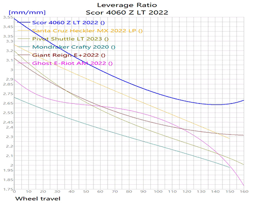 En la gráfica del Leverage Ratio vemos como el sistema es progresivo (2.6~2.15), unas cifras bastante buenas para un modelo de este tipo, pero que tampoco destacan demasiado frente a sus rivales directos. Con un 16% de progresividad el sistema no está optimizado para funcionar con un amortiguador de muelle, pero hoy en día hay amortiguadores con sistemas hidráulicos para evitar hacer topes, muelles progresivos y muchas opciones a la hora de regularlos, por lo que tampoco se puede descartar esta opción. En los montajes de serie Trek ofrece varias opciones: RS Superdeluxe y Fox Float X en los modelos de gama media y alta y un Fox Float DPS en la versión mas económica. La medida (205x60mm) está muy bien elegida y el LR Medio (2.33:1) es muy bajo, un detalle importante para los usuarios mas pesados. Por último hay que comentar que Trek ha puesto muy fácil el cambio de recorrido trasero, con un amortiguador de 205x65mm el recorrido sube hasta los 151mm de recorrido y por lo visto se puede seguir utilizando la posición Low, ya que el cuadro tiene espacio de sobra en la zona de los tirantes. La progresividad sigue siendo la misma, pero aun así creo que es una opción interesante y que permite hacer montajes un poco mas agresivos...