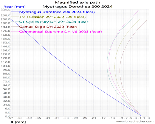 Como podéis ver en los gráficos anteriores el sistema de la Myotragus Dorothea 200 tiene una Eficacia de Pedaleo impecable, con unos porcentajes de Anti-squat en torno al 105% en todos los desarrollos. En un modelo de DH esto es un detalle que no tiene mucha importancia, porque los cassettes de siete velocidades tienen un rango muy pequeño, pero en la versión de Enduro esto puede  ser un factor mucho mas importante, ya que la mayoría de sistemas tipo HPP+Idler no se adaptan bien a un Cassete de 12v con un rango de +500%. En el resto de parámetros no hay demasiadas sorpresas... El Pedal-Kickback (-10º) es nulo, mientras que el Brake-squat (128%) se mantiene en un nivel demasiado alto.