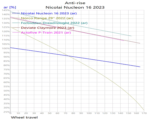 En la gráfica del Leverage Ratio vemos como el sistema es muy progresivo (3.35-2.2)(35%) y además la gráfica tiene una pendiente muy constante, por lo que podemos decir que el sistema está optimizado para funcionar con un amortiguador de muelle. El LR Medio (2.75:1) está un poco por encima de lo habitual ya este modelo utiliza un amortiguador de 230x60mm, pero dar el salto hasta uno de 250x70mm no es nada fácil cuando se utiliza un sistema tan complejo. En los montajes de serie Nicolai ofrece varias opciones y en mi opinión la mejor de todas es la del EXT Storia de muelle, es un amortiguador espectacular y bastante caro, por lo que casi ninguna marca lo monta de serie, pero en este caso es opcional y creo que merece la pena.
