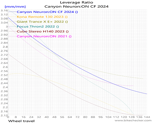 En la gráfica del Leverage Ratio vemos como el sistema es Progresivo-Lineal (3.1-2.2), pero tener un pequeño tramo lineal en los últimos milímetros de recorrido no va a afectar al funcionamiento y tampoco a la elección del amortiguador. El sistema en la práctica es bastante progresivo y va a funcionar muy bien para un uso en competiciones de Enduro. En cuanto al amortiguador Canyon ofrece varias opciones en función del montaje: Flox Float X, Fox Float X2 y RS Superdeluxe de 230x65mm y en principio creo que están bien elegidos, pero si alguien quiere probar con un RS Vivid, uno de muelle de gama alta o tal vez un RS Flight Attendant o un Fox Livevalve, creo que el resultado podría ser un poco mejor que con los amortiguadores de serie.