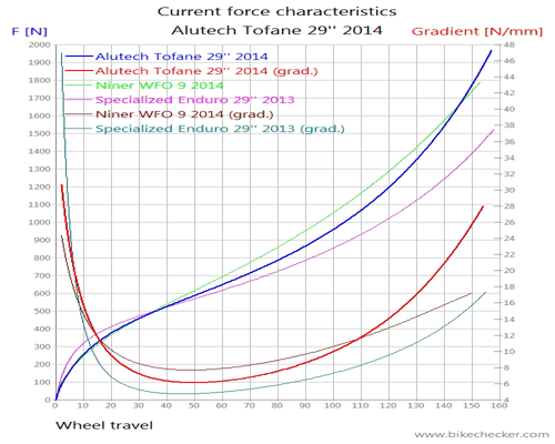En la gráfica del Leverage Ratio vemos como el sistema es del tipo Regresivo-Progresivo (2.7~2.75~2.3). Este tipo de LR no es el ideal para un modelo de "Enduro clásico" ya que el sistema tiene un tramo medio bastante blando con el que se pierde un poco de agilidad y de capacidad de salto, pero en una Ebike creo que puede dar mucho mejor resultado, ya que el estilo de conducción suele ser mucho mas relajado y con muchos menos saltos...