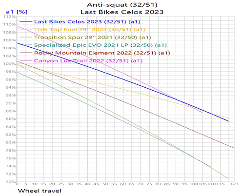 Como podéis ver en la tabla de excel y en las gráficas anteriores el sistema de suspensión de la Celos tiene una Eficacia de Pedaleo bastante buena, con unos porcentajes de Anti-squat en torno al 100% en todos los desarrollos. El sistema está bien ajustado, pero el primer tramo del recorrido es muy sensible y lo mas probable es que necesite una pequeña ayuda por parte del amortiguador en subidas por pista y tramos de enlace por carretera. El Pedal-Kickback (23º) está en un nivel intermedio, mientras que el Brake-squat (95%) se mantiene en un nivel bastante alto, ya que el sistema utiliza un basculante con tirantes flexibles.