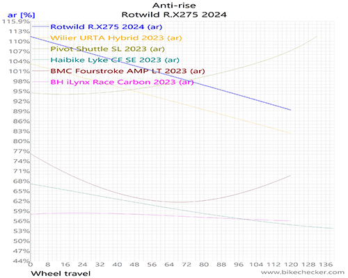 Como podéis ver en la tabla de excel y en las gráficas anteriores el sistema de la Rotwild R.X275 tiene una Eficacia de Pedaleo muy alta, con unos porcentajes de Anti-Squat en torno al 100%-120% en la mayoría de los desarrollos, por lo que el sistema no va a depender del sistema de bloqueo del amortiguador. Como es lógico, el Pedal-kickback (22º) se mantiene en un nivel intermedio y el único fallo del sistema lo encontramos en el porcentaje de Brake-squat (104%), un problema muy habitual en todos los modelos de XC con tirantes flexibles en los que se sacrifica un poco en este apartado a cambio de una rebaja de unos 200 gramos en el peso del cuadro...
